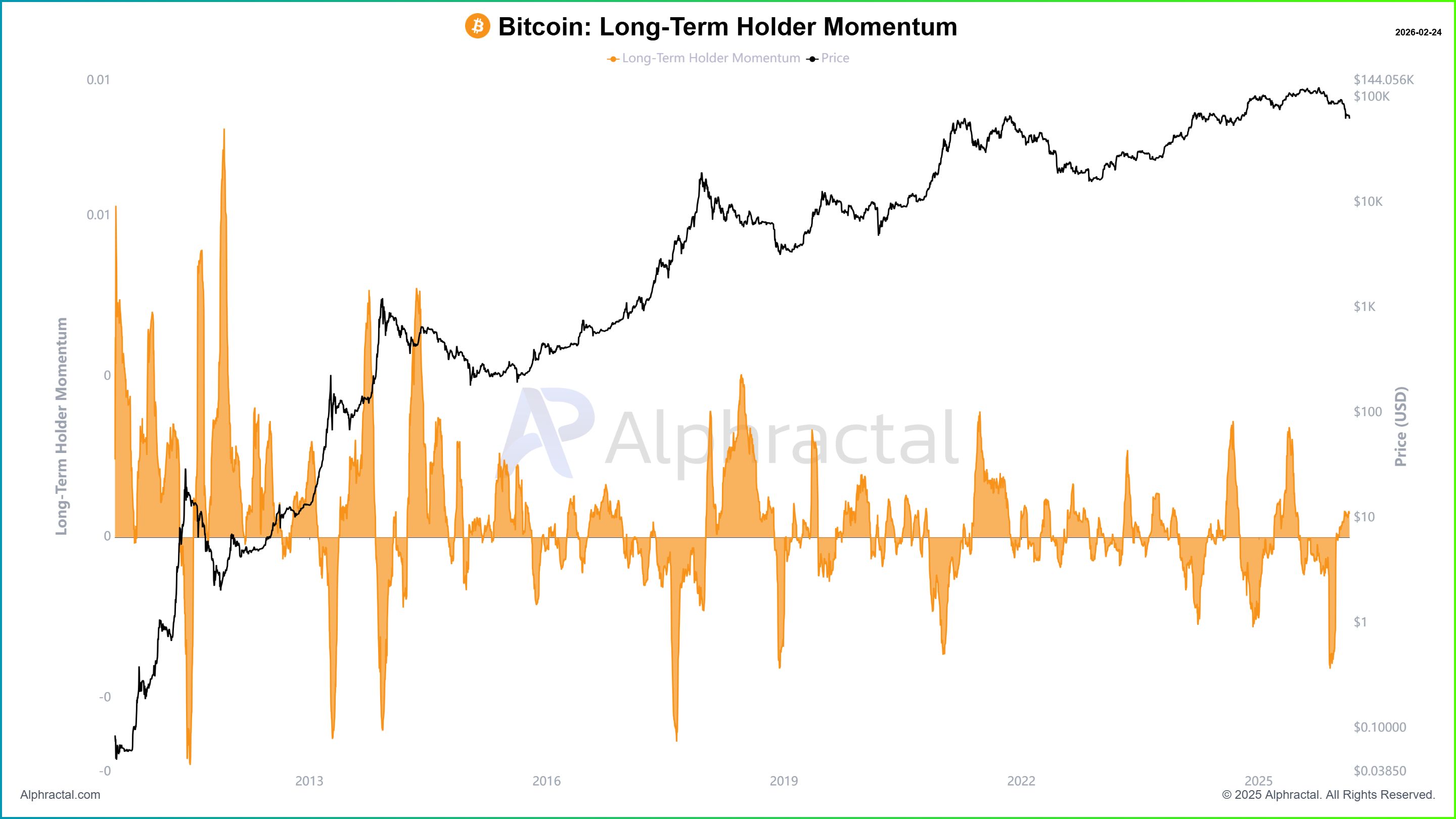 O gráfico mostra o Long-Term Holder Momentum vs. preço do Bitcoin ao longo dos ciclos.