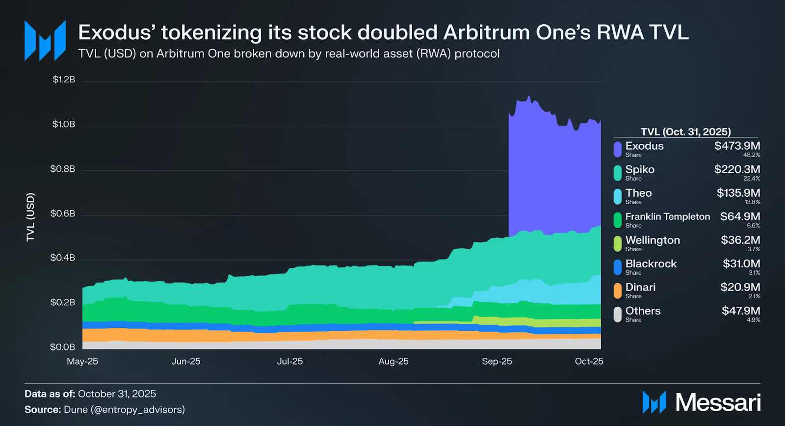 A Exodus, listada na Nasdaq, tokenizou sua Class B stock via Securitize, criando o token EXODB. Em poucas horas após o lançamento, o ativo se tornou o maior RWA individual da Arbitrum, atingindo 473,9 milhões de dólares em market cap e dobrando o TVL de RWAs da rede em um único dia.