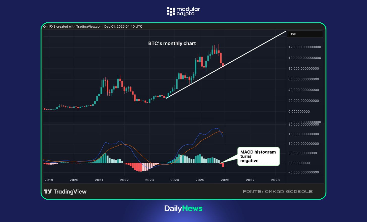 O gráfico mensal do Bitcoin mostra o MACD abrindo um histograma negativo pela primeira vez desde o início do ciclo — um movimento que, historicamente, aparece quando a tendência de alta perde força estrutural. Esse indicador mede momentum, e quando vira para baixo no timeframe mensal, costuma sinalizar períodos mais longos de consolidação ou correção. Foi assim em 2014, 2018 e 2022, sempre após um topo local e antes de quedas mais profundas.