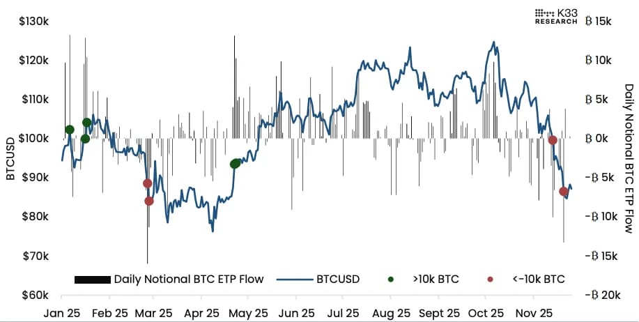 O gráfico mostra que, conforme o preço do Bitcoin caiu para a região dos US$ 87 mil, a fatia de depósitos grandes — movimentos de 100 BTC ou mais — disparou. Hoje, esses depósitos já representam cerca de 45% de todas as entradas horárias nas exchanges, um patamar que historicamente indica pressão de venda vinda dos maiores detentores. Na prática: cada vez mais BTC está sendo enviado para locais onde costuma ser vendido.