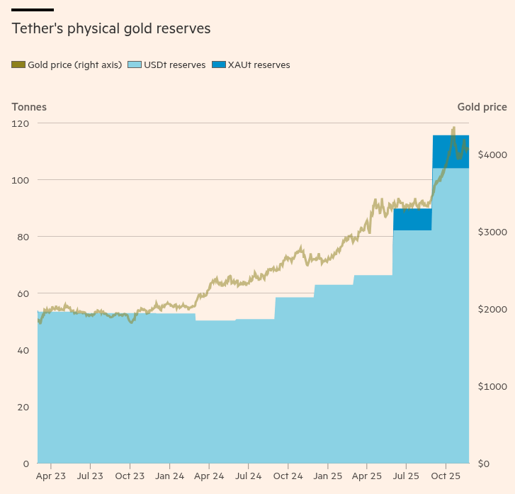 Um artigo de Bryce Elder no Financial Times trouxe mais um feito impressionante da Tether, a maior emissora de stablecoins do mundo tornou-se um dos principais compradores de ouro do planeta. Analistas sugerem que seu apetite pode ter influenciado a recente alta histórica do metal. Segundo a Jefferies, a empresa já detém cerca de 116 toneladas de ouro, volume comparável ao de pequenos bancos centrais, e suas compras no último trimestre representaram quase 2% da demanda global. O ritmo acelerado, financiado pelos lucros crescentes da operação de stablecoins, ajudaria a apertar a oferta de curto prazo e a alimentar o sentimento especulativo no mercado.