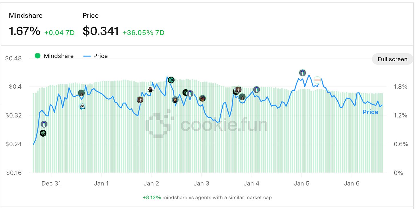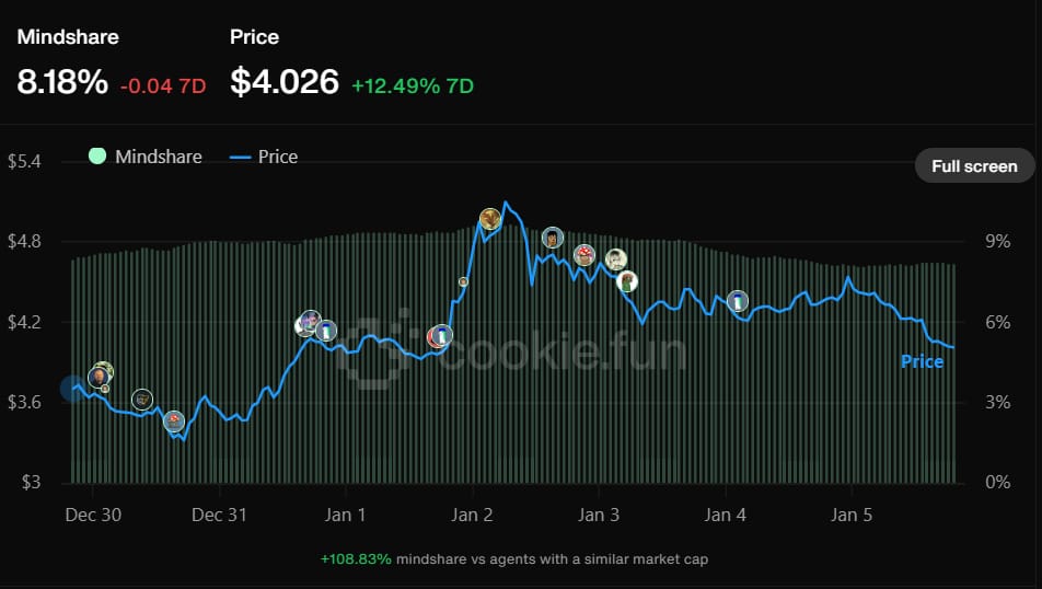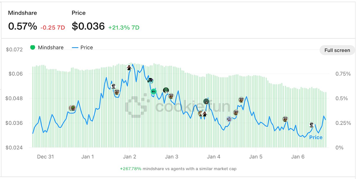 Algo que chama bastante a atenção é o dashboard de mindshare. Sabemos que os preços se movem devido à atenção, e agora podemos metrificar isso, obtendo uma noção mais precisa de quanto um agent realmente captura nas redes sociais, especialmente no X.
