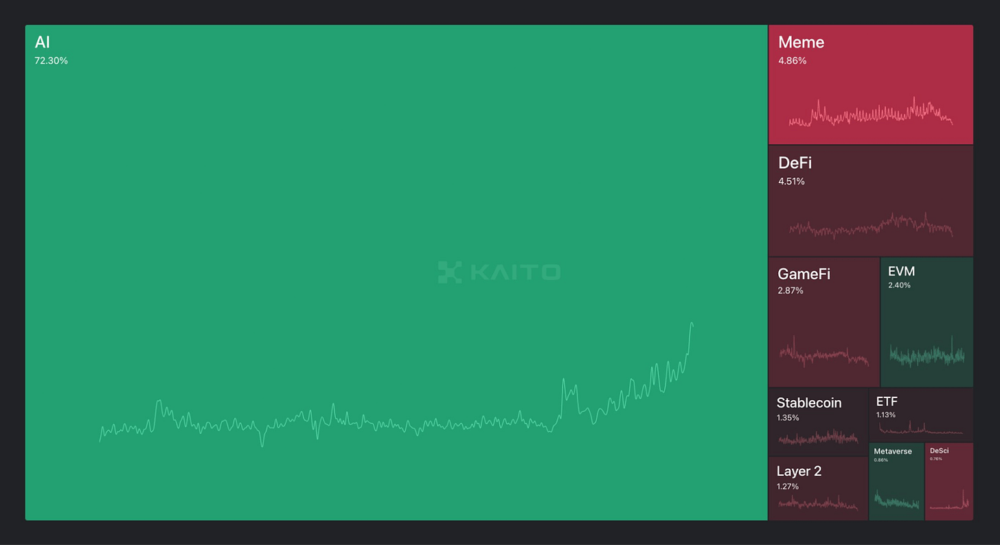 Apesar dessas incertezas, o ritmo de inovação continua acelerado. As equipes por trás desses projetos estão cada vez mais focadas em melhorar seus produtos, expandir funcionalidades e explorar novas aplicações. Segundo a plataforma Kaito, mais de 70% do mindshare atual no ecossistema cripto está voltado para inteligência artificial, evidenciando o interesse e a relevância desse setor.
