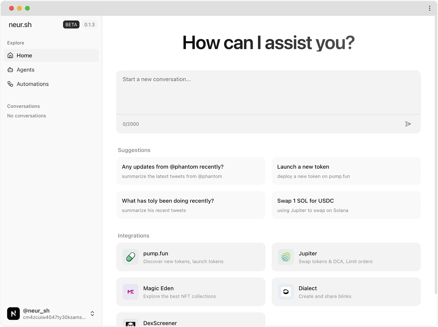 Integração Total com Solana: O Neur oferece uma interface nativa que permite executar tarefas na blockchain, com integrações diretas com os principais protocolos do ecossistema (Jupiter, Pump Fun, Magic Eden, DexScreener…)