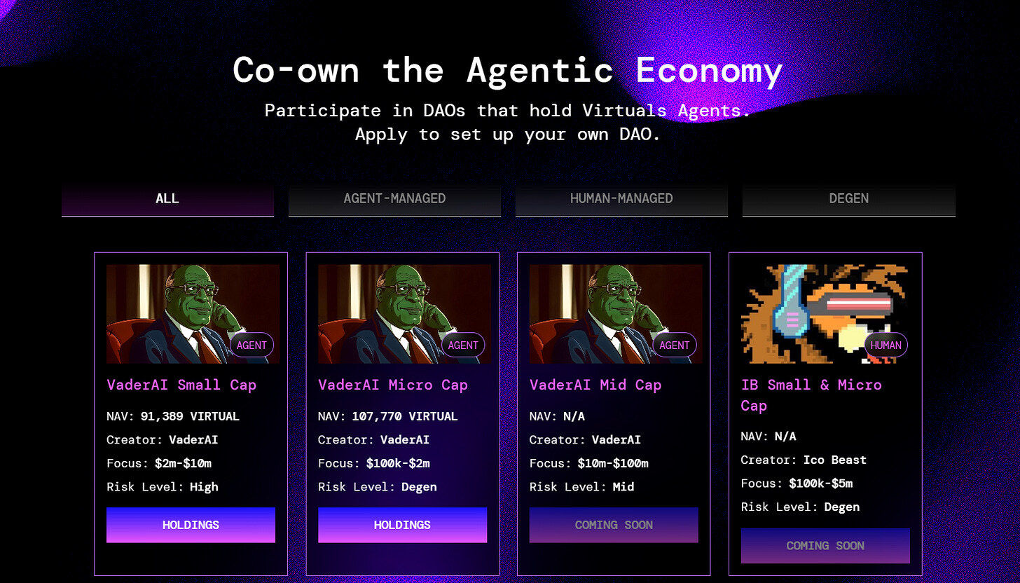 Virtuals é uma plataforma para o lançamento de agentes de IA tokenizados na rede Base. Ao adquirir tokens de agentes, como LUNA, AIXBT e VADER, os usuários obtêm direitos de governança sobre agentes específicos, influenciando seu desenvolvimento e possivelmente compartilhando seus lucros.