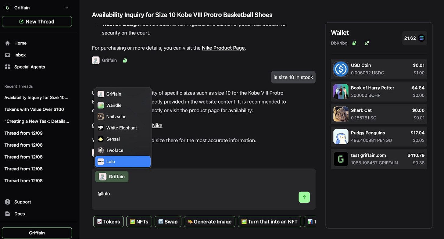 Em poucas palavras, o projeto almeja ser a loja de aplicativos IA na Solana (Pense como em uma apple store blockchain e focada em inteligência artificial), assim a Griffain se posiciona como uma plataforma focada na criação de agentes de IA dentro do ecossistema Solana, permitindo automações financeiras e de gestão on-chain.
