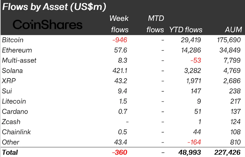 Os produtos de investimento em cripto registraram US$ 360 milhões em saídas na última semana, conforme dados do CoinShares, refletindo o tom duro do presidente do Federal Reserve, Jerome Powell, que indicou não haver garantia de novo corte de juros em dezembro. O discurso esfriou o otimismo após a redução anterior de taxas e trouxe cautela ao mercado — especialmente nos EUA, que responderam por US$ 439 milhões das retiradas, concentradas em ETFs de Bitcoin (US$ 946 milhões).