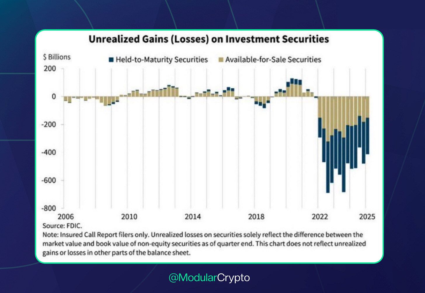 O gráfico da FDIC mostra que os bancos americanos seguem afundados em prejuízos com títulos — somando mais de US$ 700 bilhões em perdas não-realizadas desde 2022, sendo US$ 413 bilhões só em 2025. Essas perdas vêm principalmente de títulos de renda fixa que desvalorizaram com a alta dos juros.