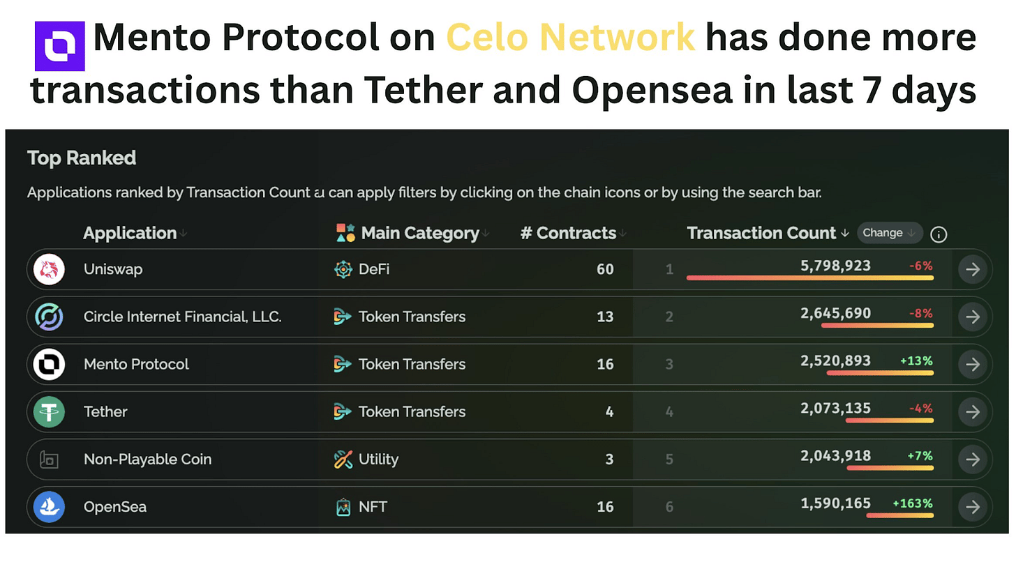 A evolução recente do Mento, ultrapassando Tether e OpenSea em transações, não é apenas um dado impressionante. É um sinal claro de que as finanças descentralizadas podem operar com propósito e escala real. Enquanto muitos dApps ainda giram em torno da especulação, o Mento está operando na economia concreta, alimentando iniciativas que importam.