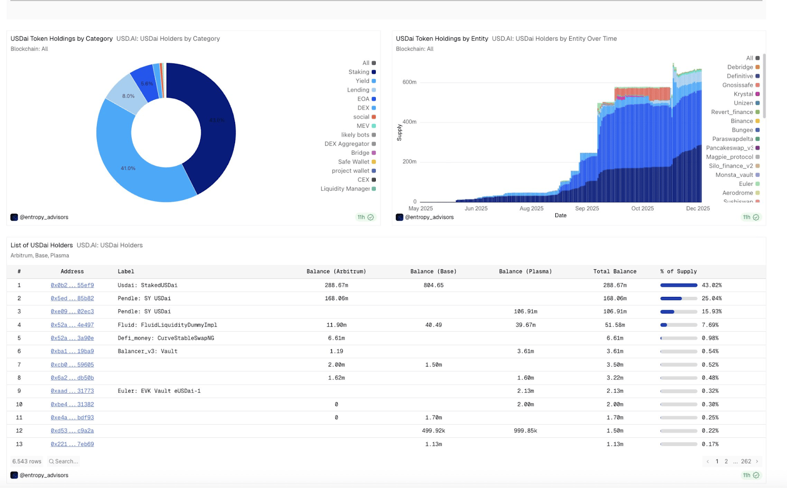 Outro dado relevante está no comportamento dos holders. Cerca de 40% do supply do USDai está em staking, sendo convertido em sUSDai. A Arbitrum concentra a maior parte de todo o supply, com mais de 480 milhões, seguida por Plasma e Base. Quando se observa onde o capital está alocado, mais de 43% permanece em staking, cerca de 40% está posicionado na Pendle e aproximadamente 7% na Fluid.