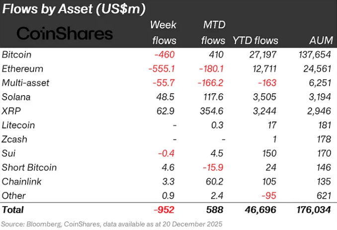 🟥 Cripto registra saídas globais de US$ 952 mi: incerteza regulatória nos EUA, atraso do Clarity Act e resgates concentrados em BTC e ETH pressionam os fluxos, enquanto Solana e XRP seguem atraindo capital seletivo.