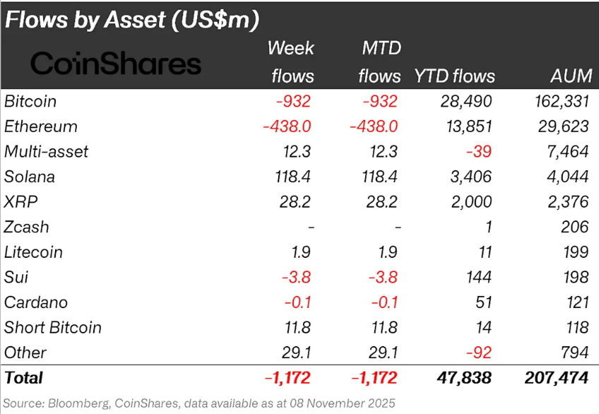 š SaĆdas institucionais persistem, mas altcoins resistem ā CoinShares aponta -US$ 1,17 bi na semana (pressĆ£o em BTC/ETH), enquanto Solana lidera entradas e narra o risco āfora do eixoā.