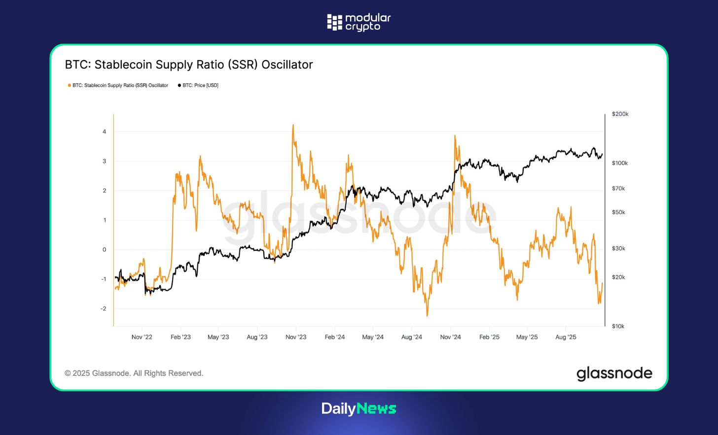 O Stablecoin Supply Ratio (SSR) — indicador que compara o valor total das stablecoins com o do Bitcoin — segue em níveis historicamente baixos, mostrando que há grande volume de liquidez parada em stablecoins. Na prática, isso significa que há muito “poder de compra” esperando o momento certo para entrar no mercado.
