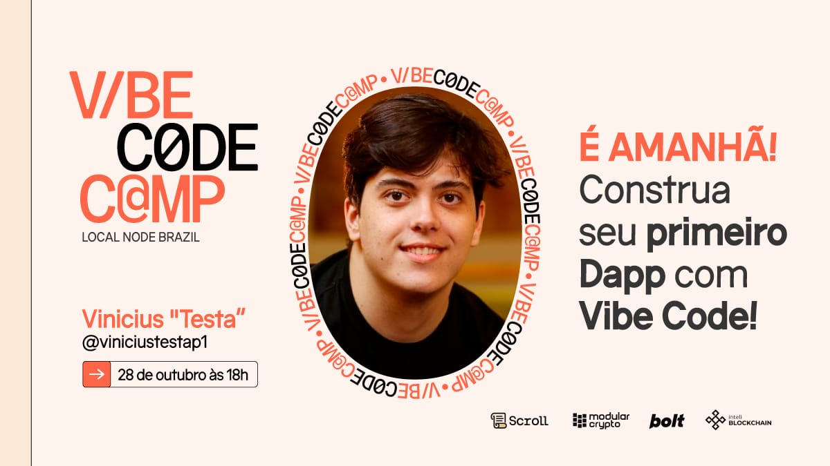 🎥 Vibe Code Camp amanhã! A última chamada pra criar seu dApp na Scroll sem escrever código. Aula com Vinicius “Testa” Passos mostrando na prática como usar Bolt e Cloak.