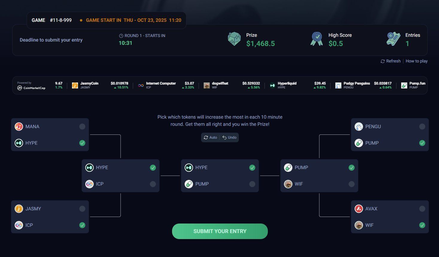 É o jogo que transforma feeling de mercado em estratégia — direto na Hyperliquid EVM, com dados do CoinMarketCap e rodadas novas o tempo todo.