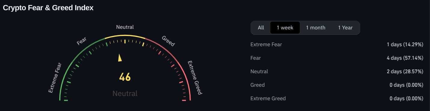 😱 Índice Medo & Ganância: o sentimento melhorou, saindo do medo e voltando para o neutro, com 46 pontos no fechamento dessa edição.